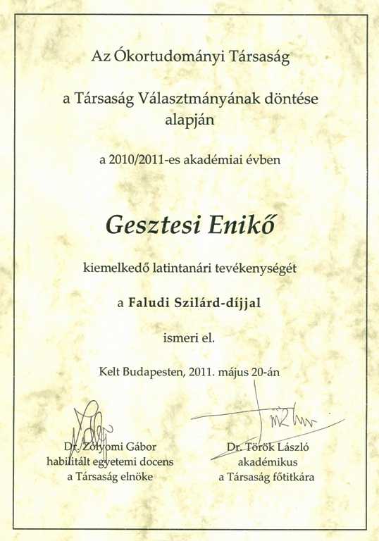2011. 05. 20., p – 00:00 Faludi Szilárd-díjat kapott dr. Gesztesi Enikő Több éves eredményes tehetséggondozó munkájának elismeréseként dr. Gesztesi Enikő latin tanári tevékenységét az Ókortudományi Társaság Faludi Szilárd-díjjal ismeri el.