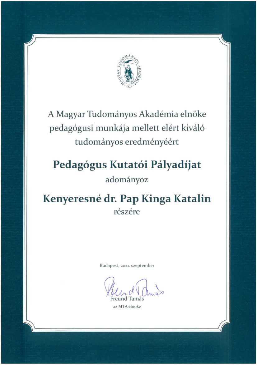 Pedagógus Kutatói Pályadíjat kapott Kenyeresné dr. Pap Kinga Katalin