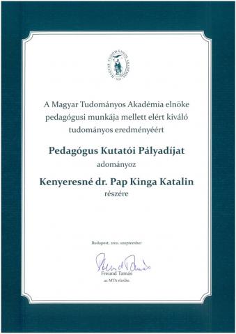 2021-ben tizenkét kutató pedagógus munkáját ismerte el az Akadémia. A tudomány művelésének és a tanításnak kiemelkedően magas színvonalú művelését ismeri el az MTA a Pedagógus Kutatói Pályadíjjal.